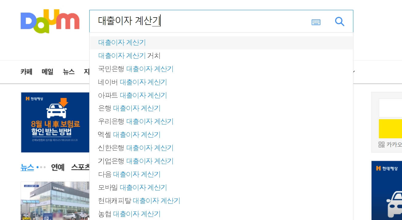 1. 다음(daum) 검색창에 "대출이자 계산기"라고 검색을 합니다.