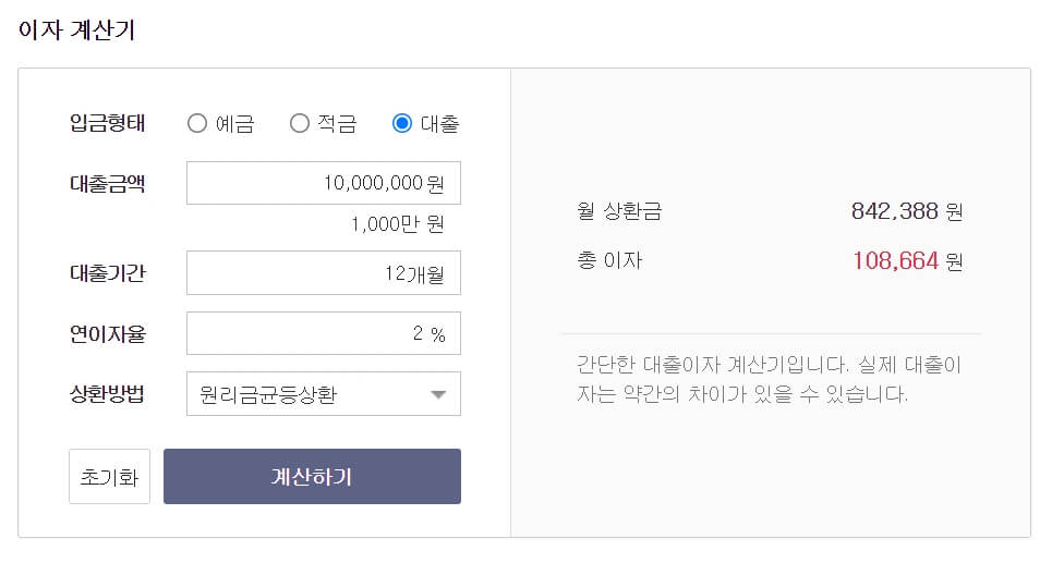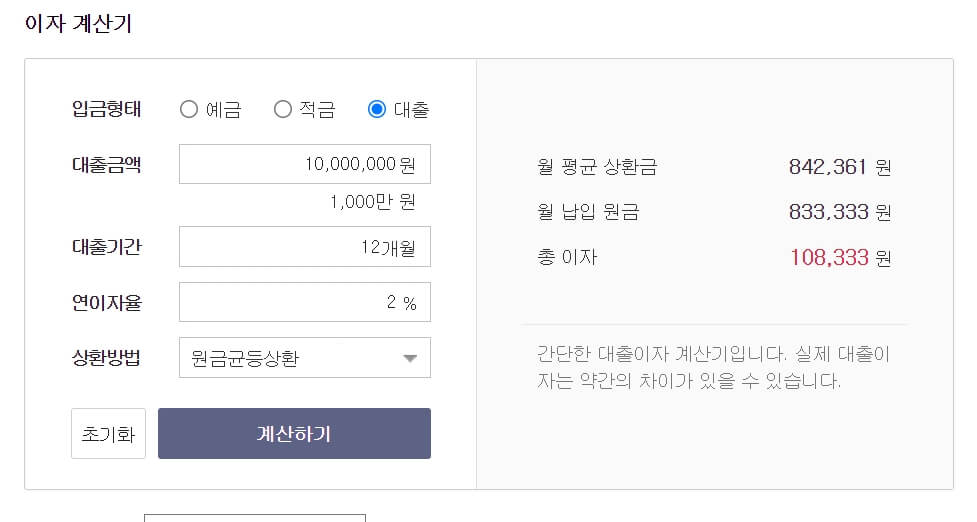 예를 들어 대출금액 1,000만원, 대출기간 12개월, 연이자 2%, 원금균등상환, 원리금균등사환, 원금만기일시상환방식으로 각각 계산해보겠습니다.