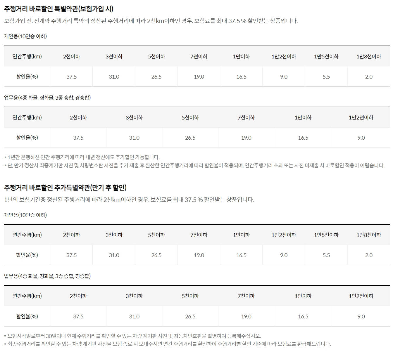 - 1년의 보험기간 중 주행거리가 작을수록 보험료를 할인받는 할인형 주행거리 바로할인 특약으로 최고 37.5%의 할인을 받으실 수 있습니다.