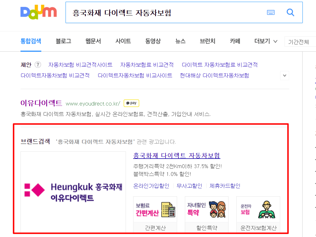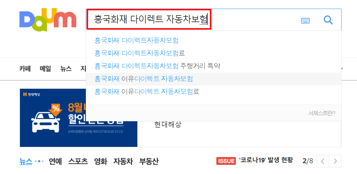 1. 다음(daum) 검색창에 "흥국화재 다이렉트 자동차보험"이라고 검색을 합니다.