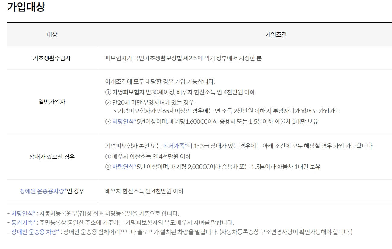 - 부상: 1인당 1천만원, 2천만원, 3천만원, 5천만원, 1억원 한도 내 실비보상(자기신체사고가 체결되지 않은 경우에 한하여 가입 가능).