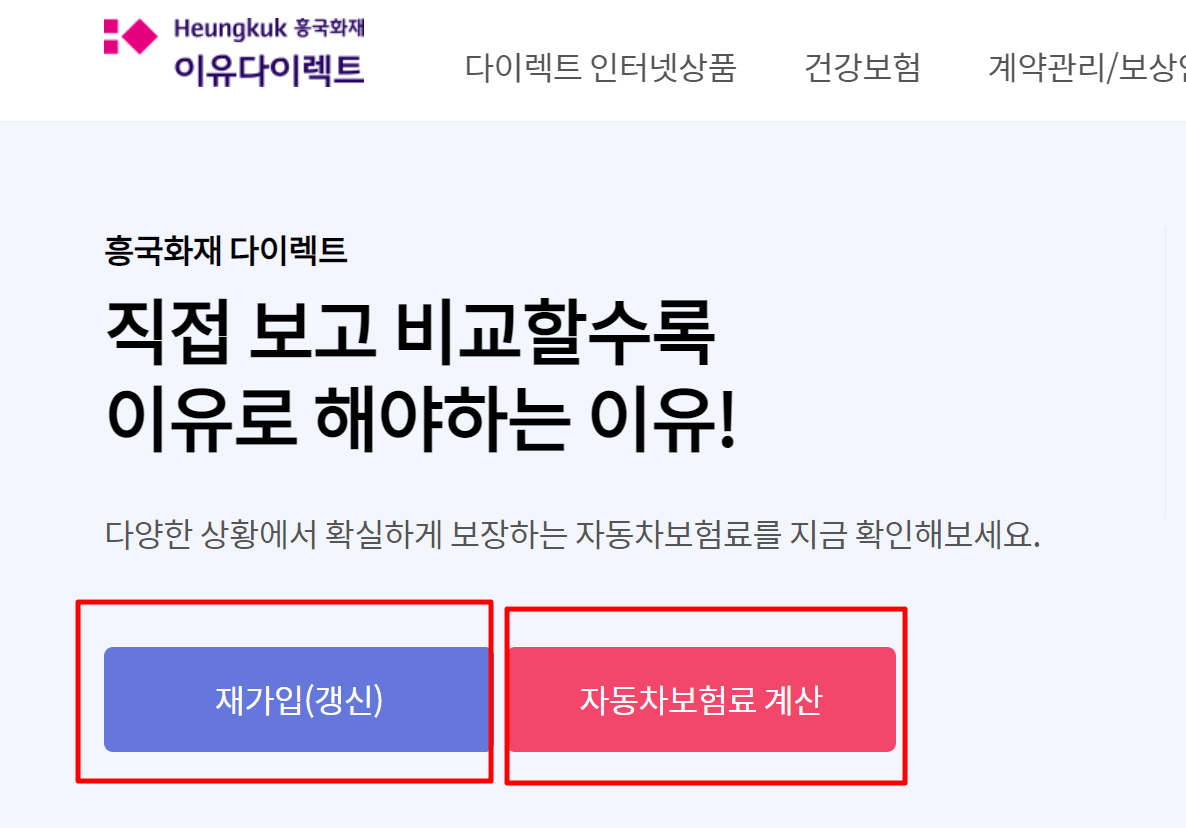 3. 흥국화재 다이렉트 자동차보험 홈페이지에 접속을 하시면 재가입(갱신), 자동차보험료 계산이 있습니다. 여기를 누르셔서 절차대로 입력하시면 보험료가 확인이 되고 가입 및 갱신을 하시면 됩니다.