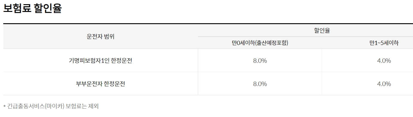 - 출산 예정이거나 만 5세 이하 자녀가 있는 경우 보험료 4~8%를 할인해주는 특약입니다.