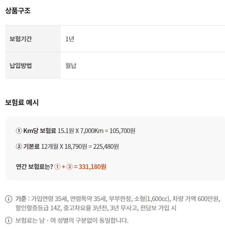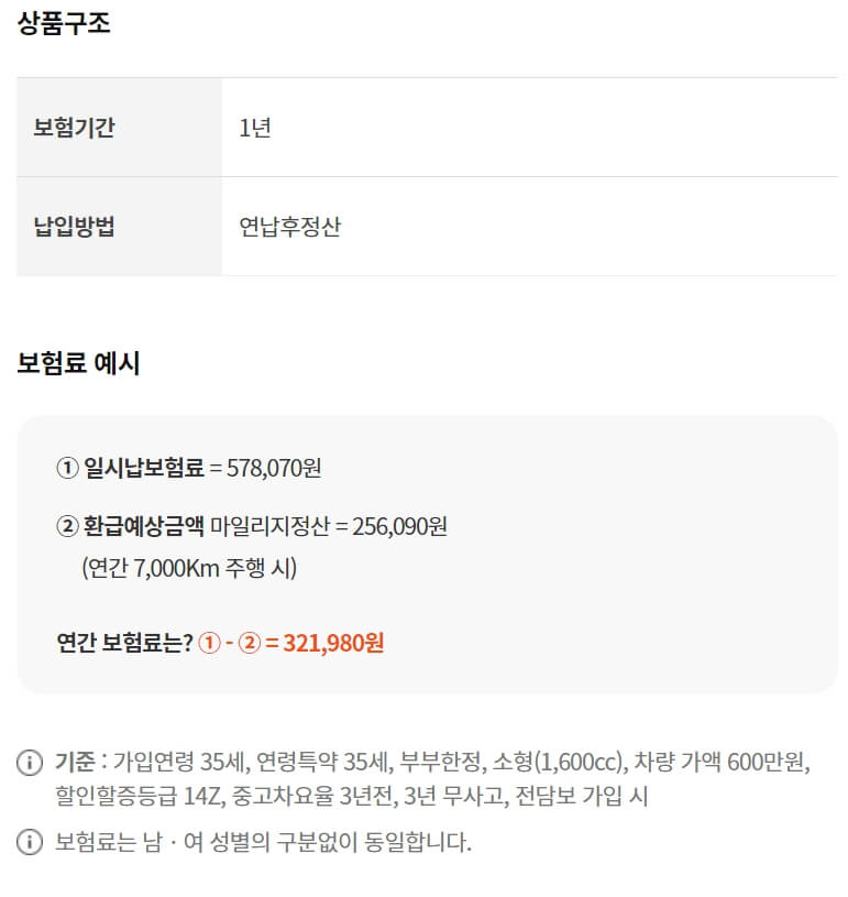 ※ 보험 가입시 첫 달 기본료 + 1,000km에 해당하는 보험료를 선납하고, 이후 보험료는 매월 추행한 거리만큼만 계산(선납한 1,000km 보험료는 만기 후 정산).