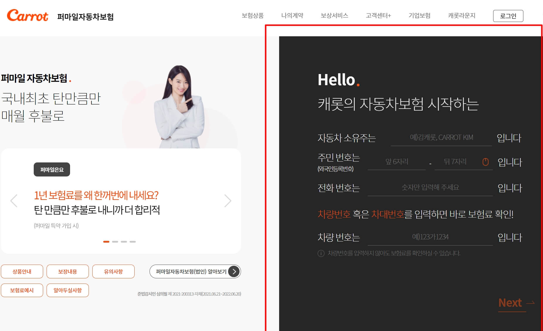 3. 캐롯퍼마일자동차보험 홈페이지에서 오른쪽 빨간색 네모칸을 보시면 "자동차 소유주" "주민번호" "전화번호" 차량번호" 등을 입력하시면 자동차보험 가입 및 갱신을 하실 수 있습니다.
