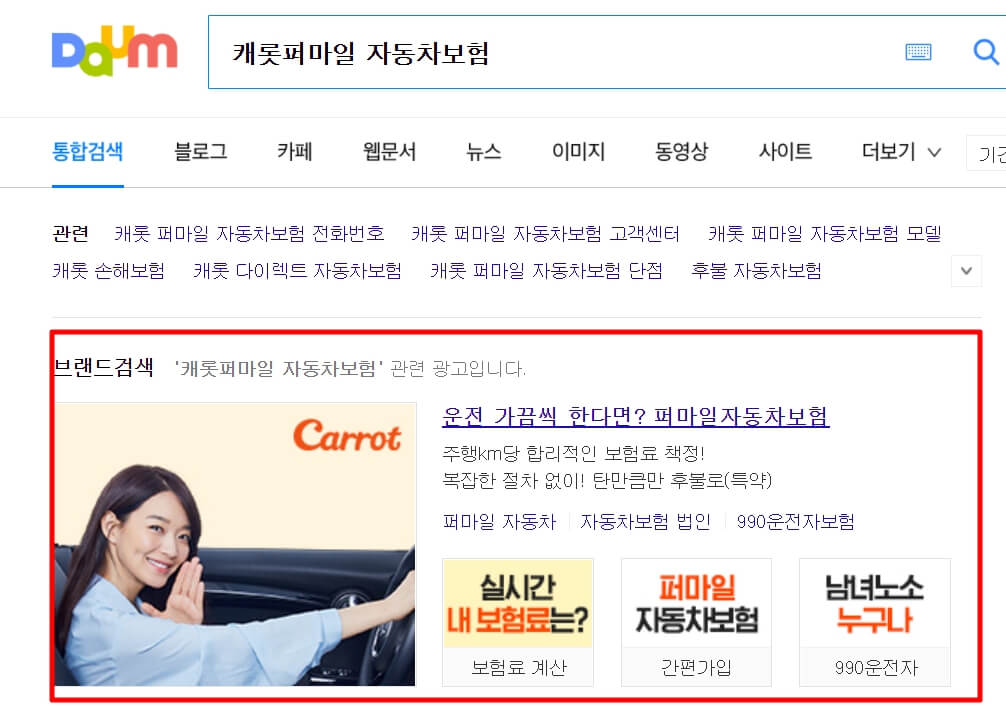 1. 다음(daum) 검색창에 "캐롯퍼마일 자동차보험"이라고 검색을 합니다.