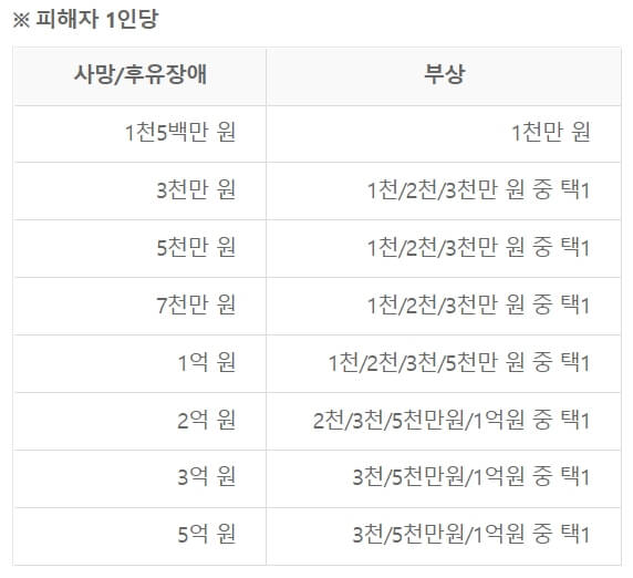 - 피보험자동차 사고로 다른 사람을 죽게 하거나 다치게 하여 법률상 손해배상책임을 짐으로써 입은 손해를 보상합니다.