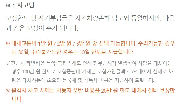 - 자기차량손해와 보상하는 경우는 기본적으로 동일하지만, 자기차량손해 담보에서 보장하지 않는 대체교통비, 전손 시 제반 비용 특약, 원격지 사고 시 운반비용도 보상합니다.