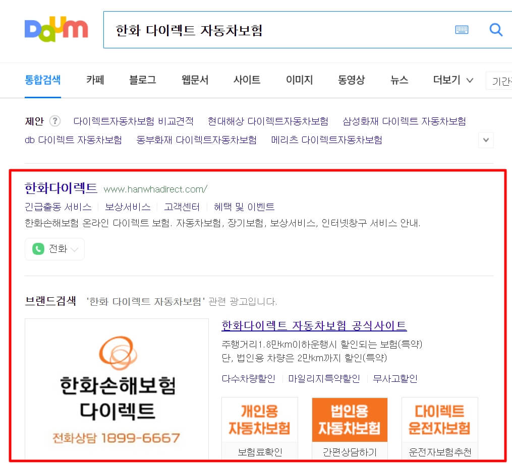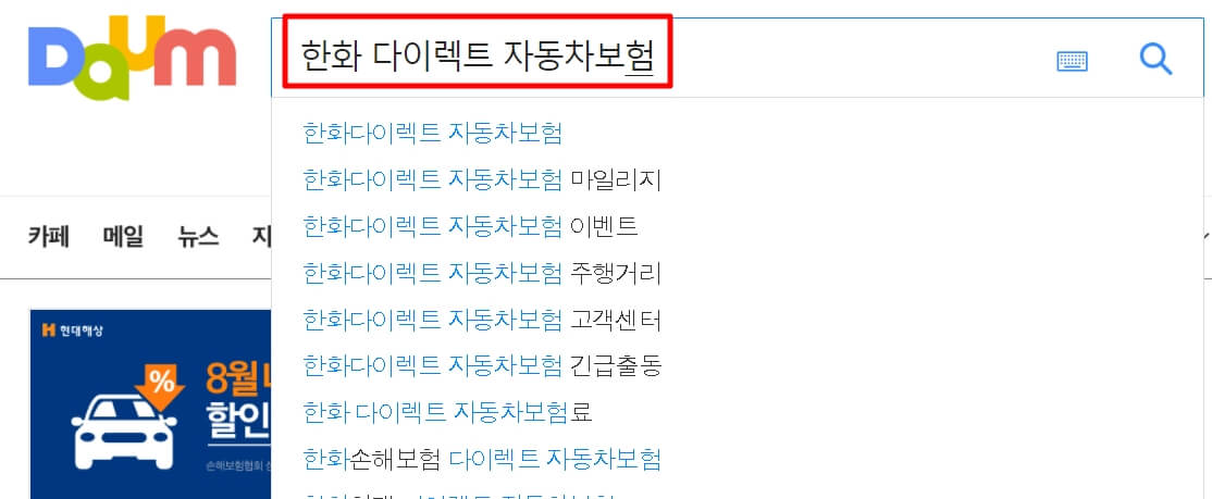 1. 다음(daum) 검색창에 "한화 다이렉트 자동차보험"이라고 검색을 합니다.