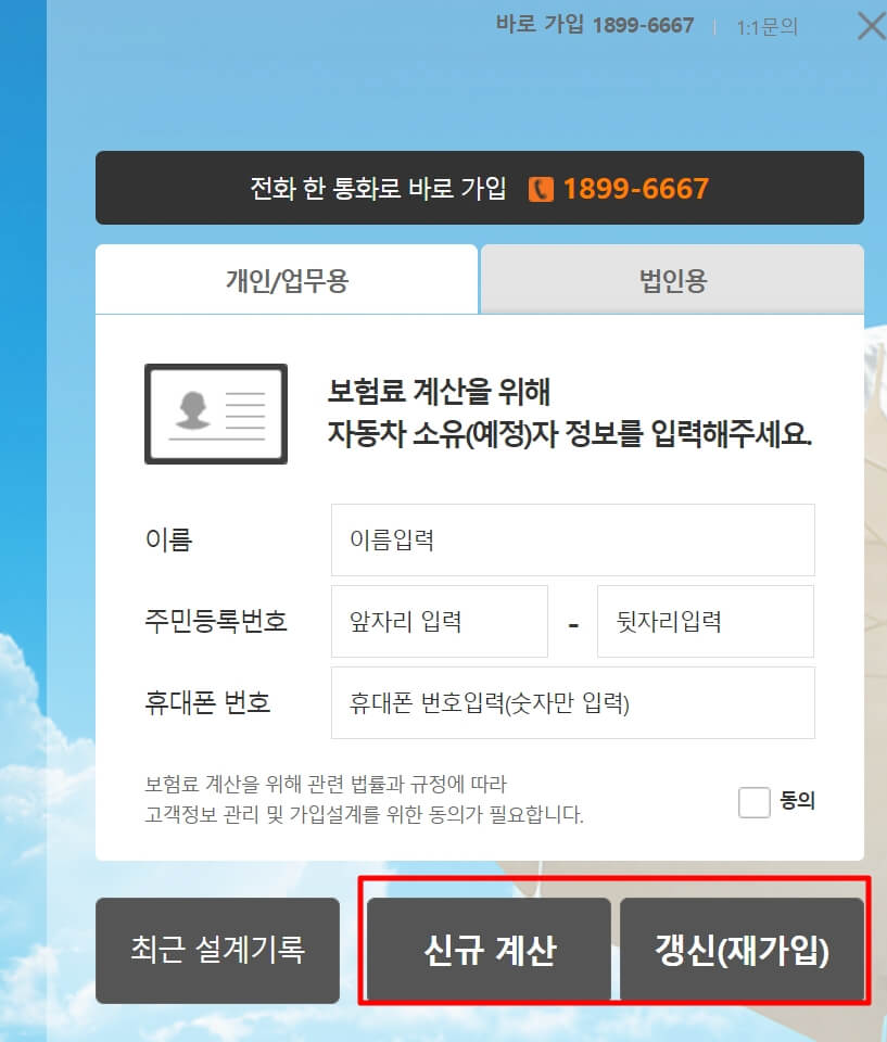 3. 한화 다이렉트 자동차보험 홈페이지에 접속을 하시면 "신규 계산" "갱신(재가입)"을 누르셔서 절차대로 입력하시고 가입을 하시면 됩니다.