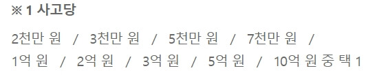 - 자동차를 시험용으로 운행하거나, 경기용으로 사용하는 경우 보상하지 않습니다.