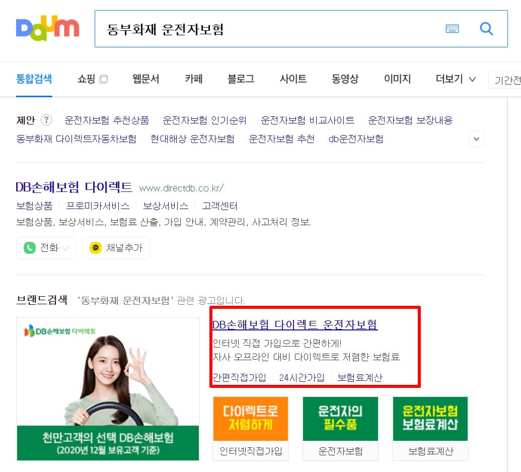1. 다음(daum) 검색창에 "동부화재 운전자보험"이라고 검색을 합니다.