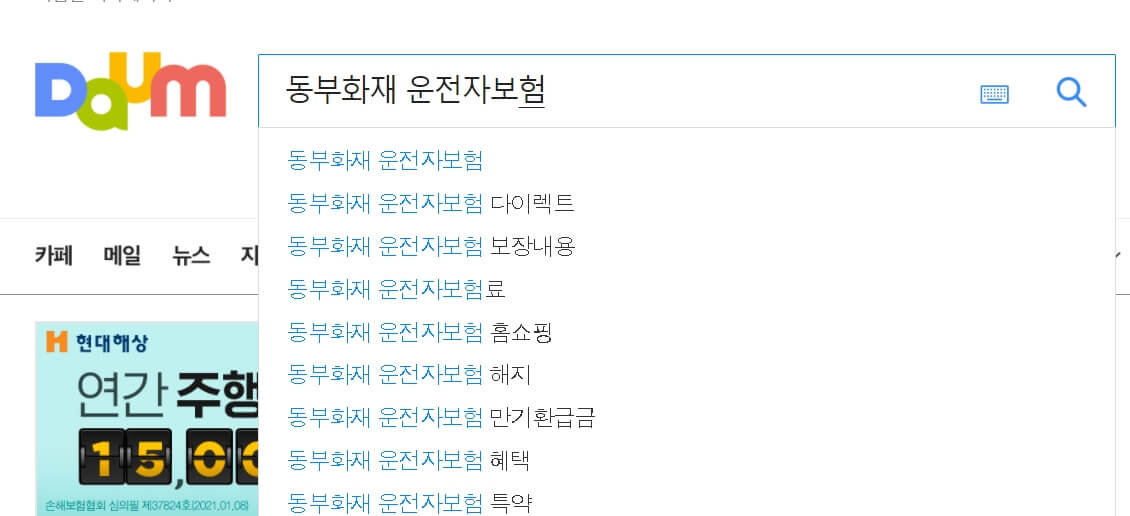 1. 다음(daum) 검색창에 "동부화재 운전자보험"이라고 검색을 합니다.