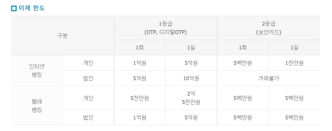 신협 인터넷뱅킹 이체한도는 인터넷뱅킹이랑 텔레뱅킹이 한도가 다릅니다. 아래 표를 참고하시면 자세히 확인하실 수 있습니다.