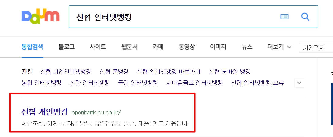 1. 다음(daum) 검색창에 "신협 인터넷뱅킹"이라고 검색을 합니다.