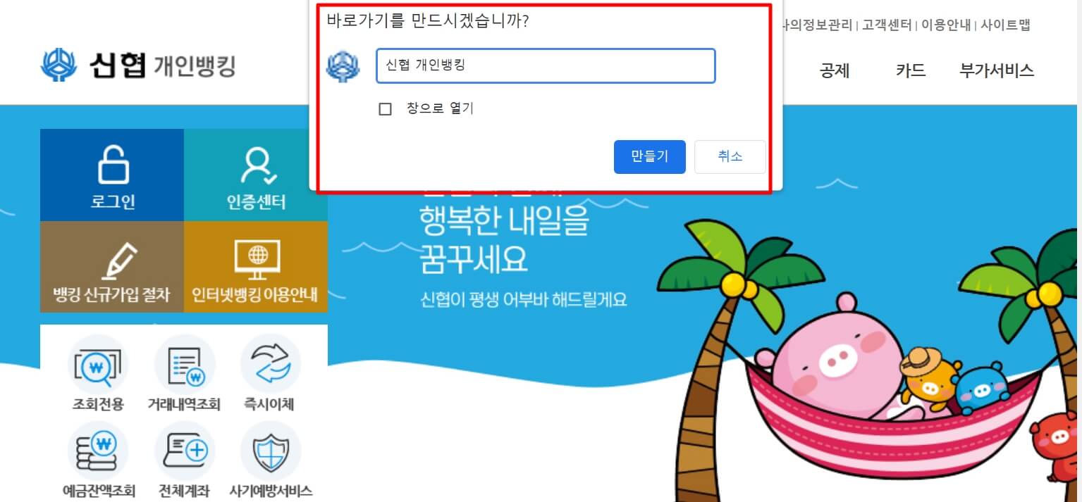6. 바탕화면에 신협 인터넷뱅킹 아이콘이 생성이 됩니다. 신협 아이콘만 누르시면 신협 인터넷뱅킹 홈페이지에 바로 접속을 하실 수 있습니다. 그리고 예금조회, 이체, 공과금 납부, 공인인증서 발급, 대출, 카드 이용안내 등 서비스를 이용하실 수 있습니다.