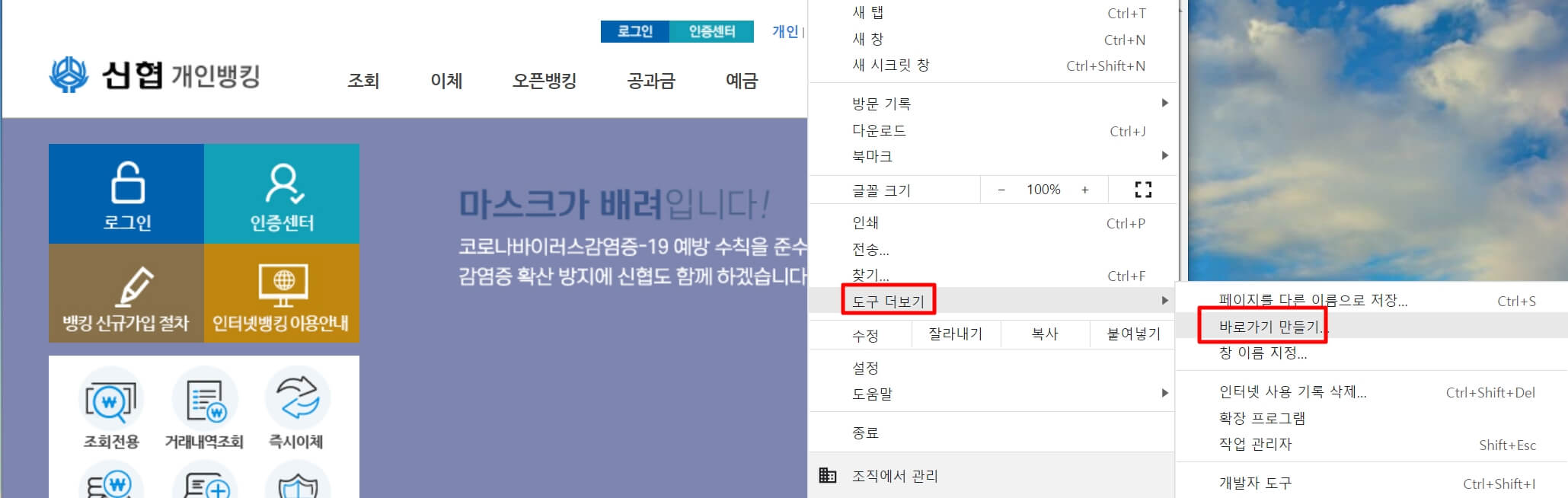 4. "도구 더보기" "바로가기 만들기"를 누릅니다.