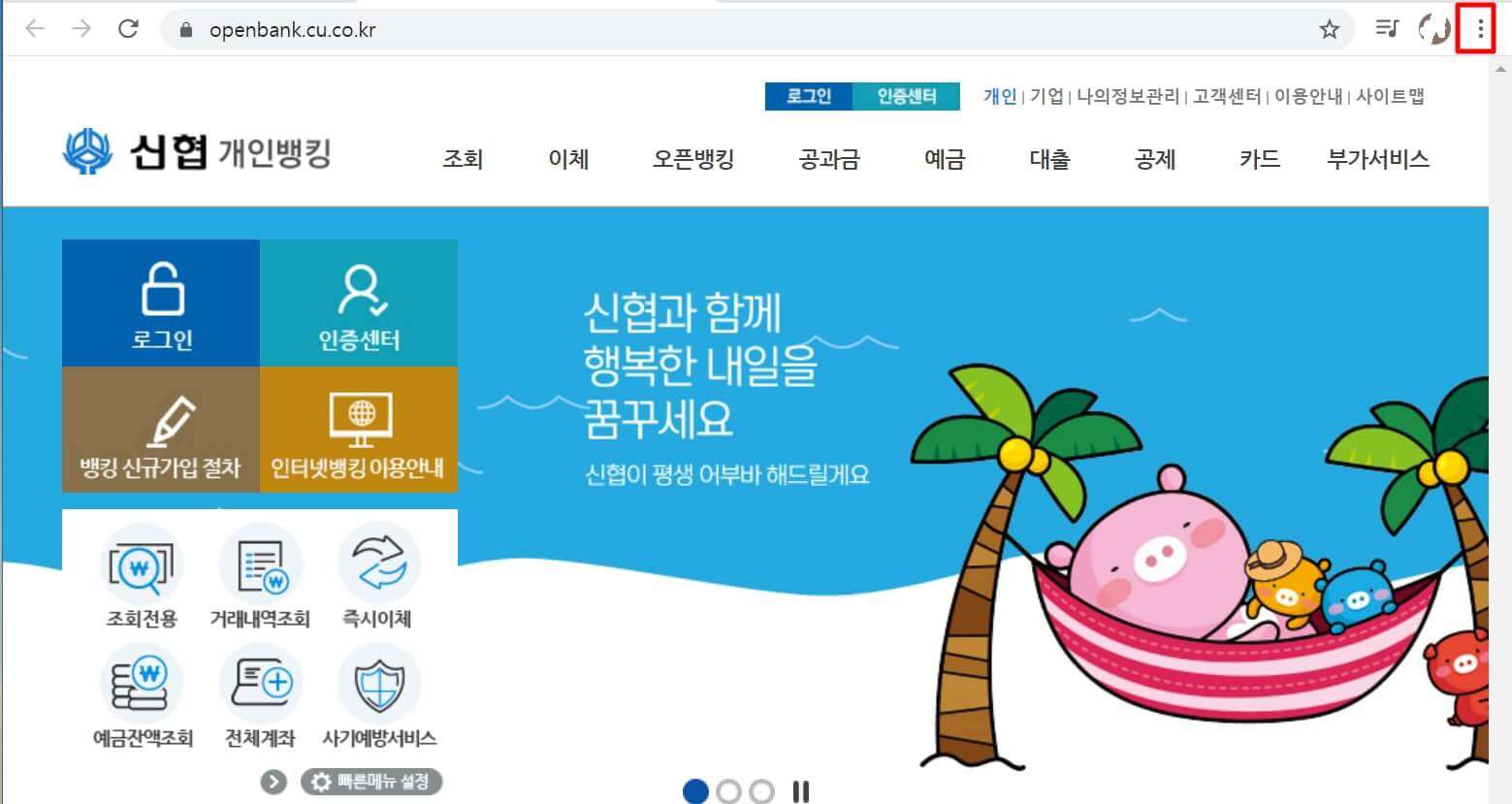3. 신협 인터넷뱅킹 홈페이지에 들어가셔서 오른쪽 상단에 보시면 "점 3개"를 누릅니다.