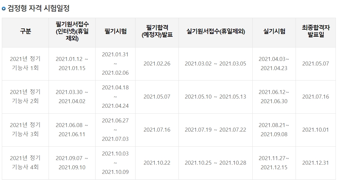 21년 정기기능사 1회, 2회, 3회, 4회 시험 일정은 다음과 같습니다.