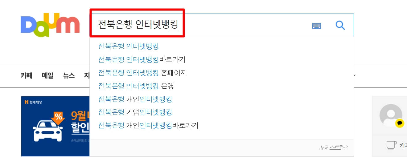 1. 다음(daum) 검색창에 "전북은행 인터넷뱅킹"이라고 검색을 합니다.