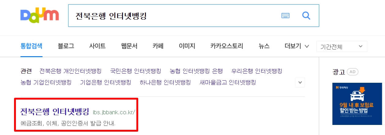 1. 다음(daum) 검색창에 "전북은행 인터넷뱅킹"이라고 검색을 합니다.