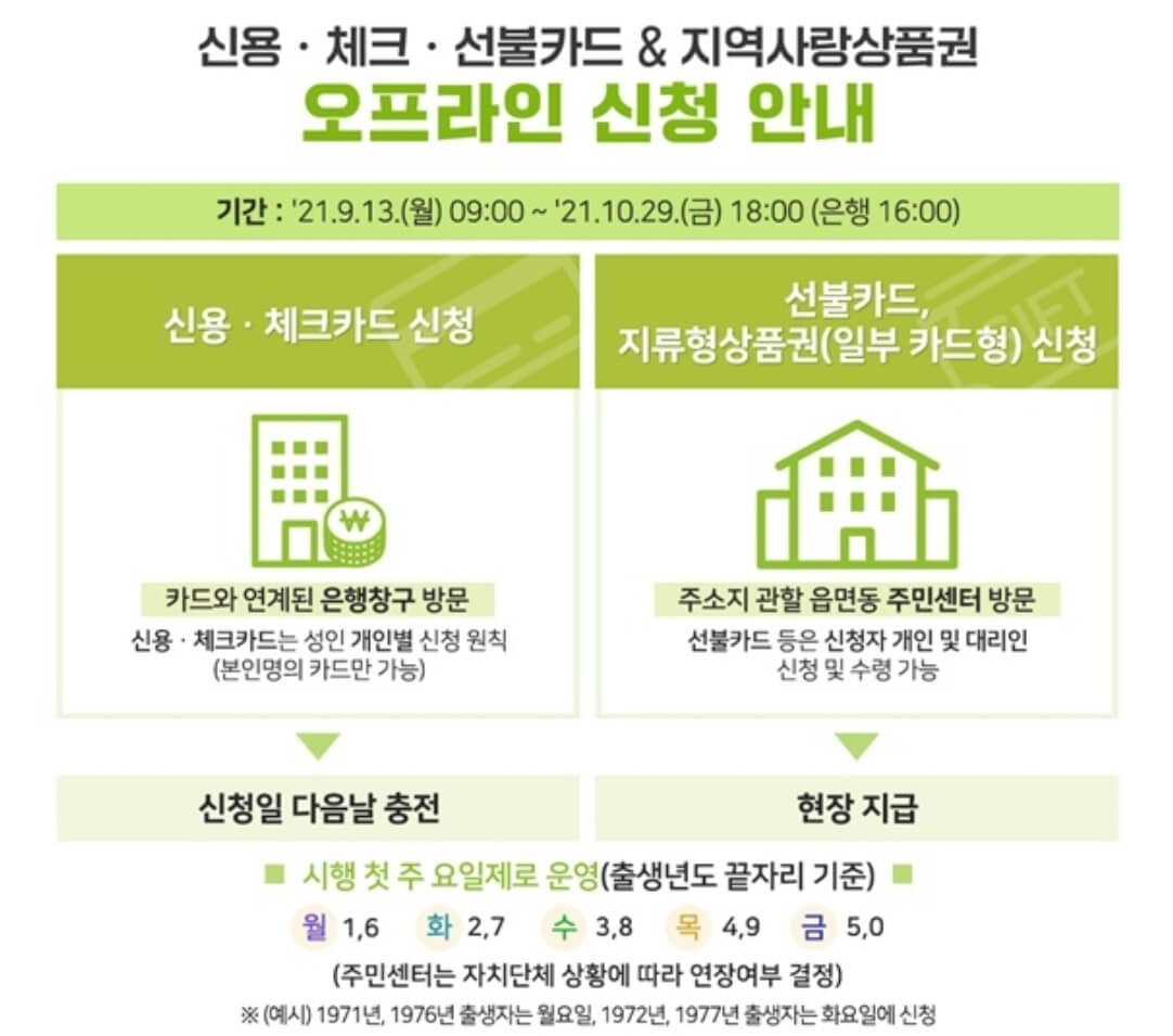 신용카드, 체크카드로 받으시려는 분은 카드사와 연계된 은행 창구에서 신청이 가능하며, 지역사랑상품권, 선불카드로 받으시려는 분들은 읍면동 주민센터에서 신청하실 수 있습니다.
