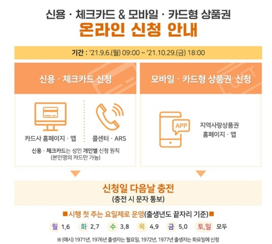 ※ 단, 미성년 자녀는 동일 주소지 세대주 명의로 신청, 세대주인 미성년자는 체크카드, 본인 계좌와 연결된 모바일, 카드형 상품권으로 직접 신청, 수령 가능