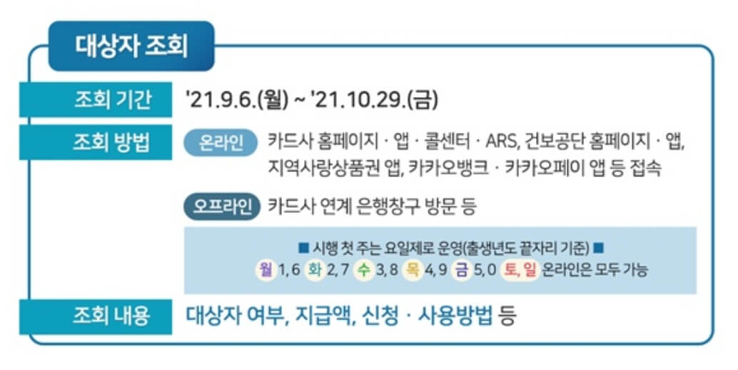 국민지원금 지급 대상 여부는 9월 6일(월) 09시부터 카드사 홈페이지(앱), 건강보험공단 홈페이지(앱) 등에서 조회할 수 있습니다.