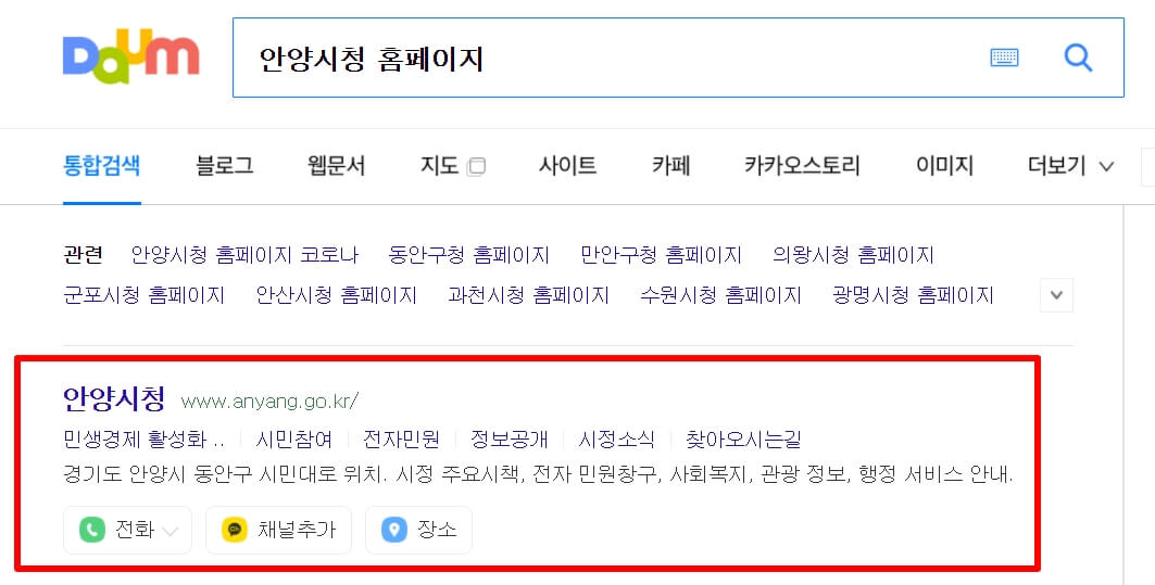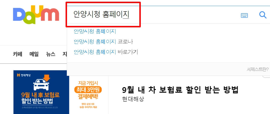 1. 다음(daum) 검색창에 "안양시청 홈페이지"라고 검색을 합니다.