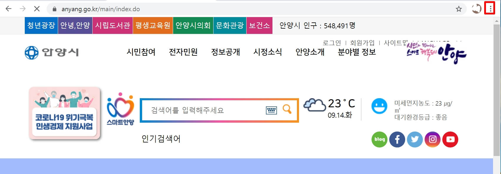 4. 안양시청 홈페이지에 들어가셔서 오른쪽 상단에 보시면 "점 3개"를 누릅니다.