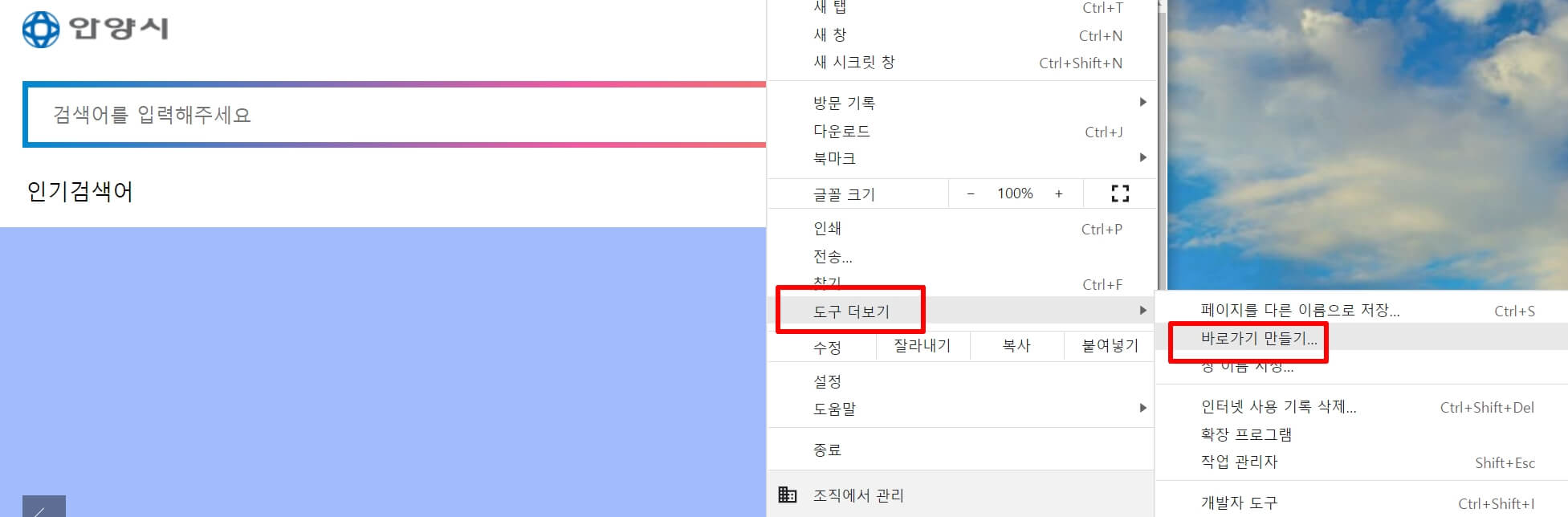 5. "도구 더보기" "바로가기 만들기"를 누릅니다.