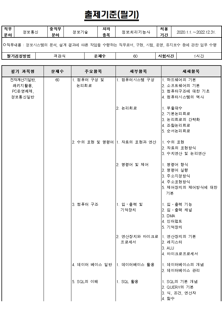 가장 많이 알려져 있고, 인기 있는 자격증 중 하나인 정보처리기능사인데요. 정보 처리를 함에 있어서 가장 기본적인 것들을 물어보는 자격증입니다.