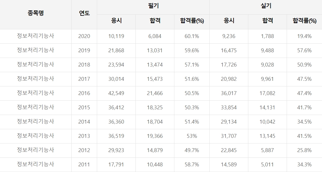 정보처리기능사 시험 최근 10년간 응시자, 합격자, 합격률은 다음과 같다.