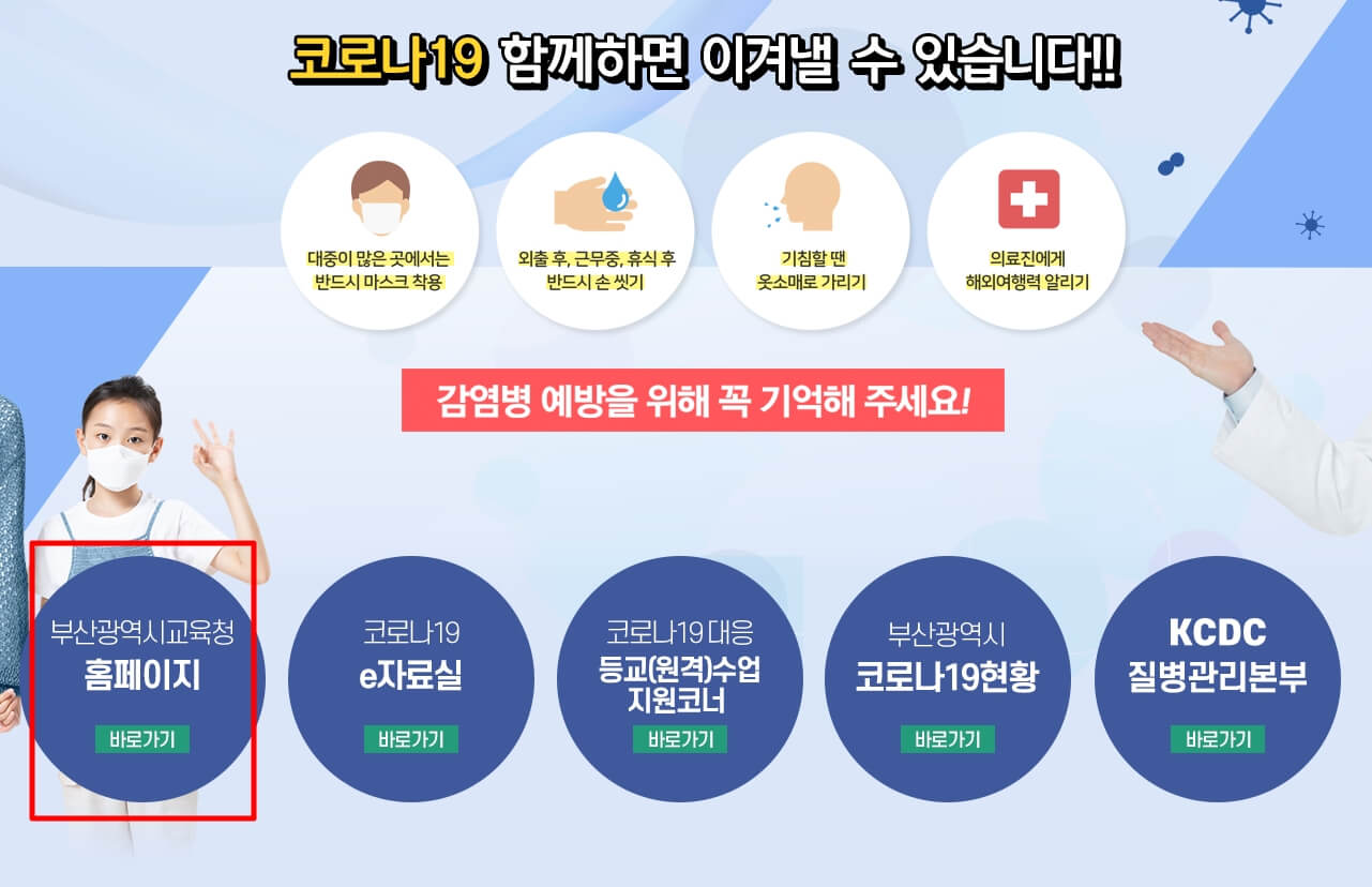 3. 부산시 교육청 홈페이지에 바로 접속이 되지 않고, "부산시 교육청 홈페이지 바로가기" "코로나19 e자료실 바로가기" "코로나19 대응 등교(원격)수업 지원코너 바로가기" "부산시 코로나19 현황 바로가기" "질병관리본부 바로가기" 가 나옵니다. 첫번째인 부산시 교육청 홈페이지 바로가기를 누르셔서 접속을 합니다.