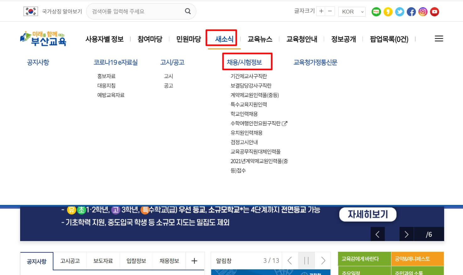 4. 상단에 새소식 - 채용시험정보를 눌려서 접속을 합니다.