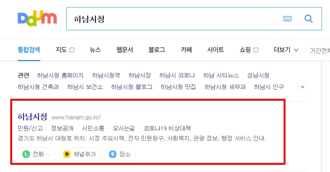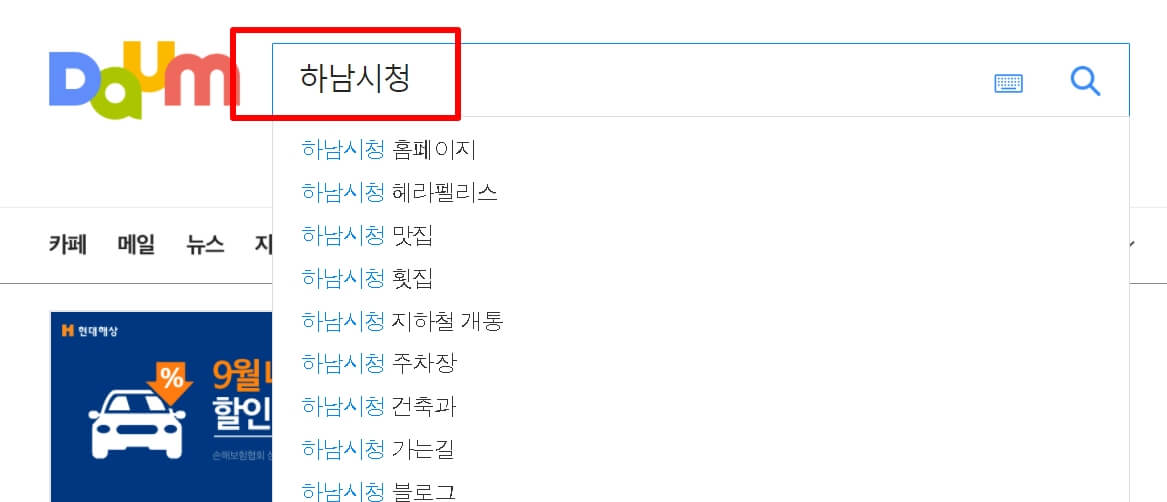 1. 다음(daum) 검색창에 "하남시청 홈페이지"라고 검색을 합니다.