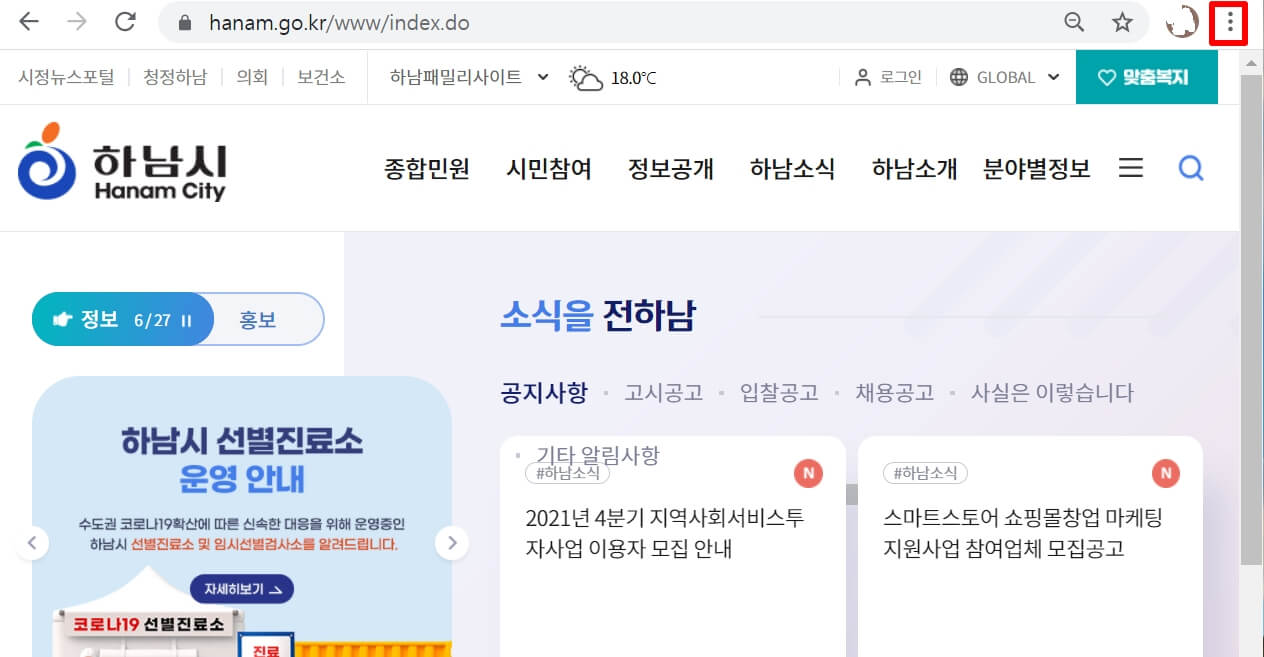 4. 하남시청 홈페이지에 들어가셔서 오른쪽 상단에 보시면 "점 3개"를 누릅니다.