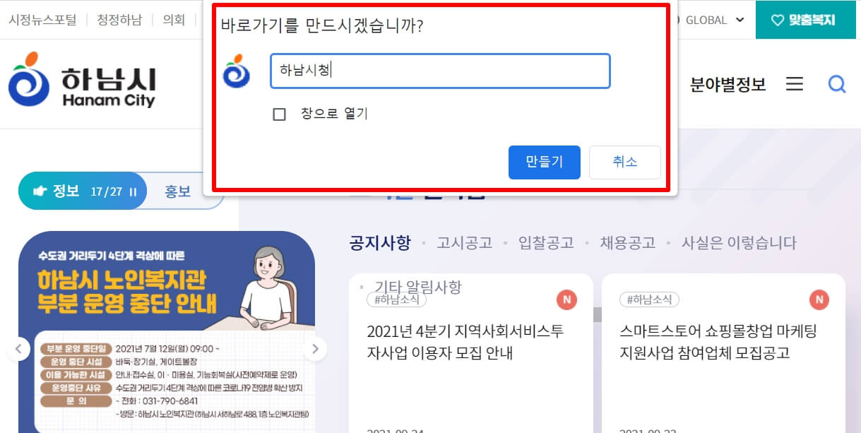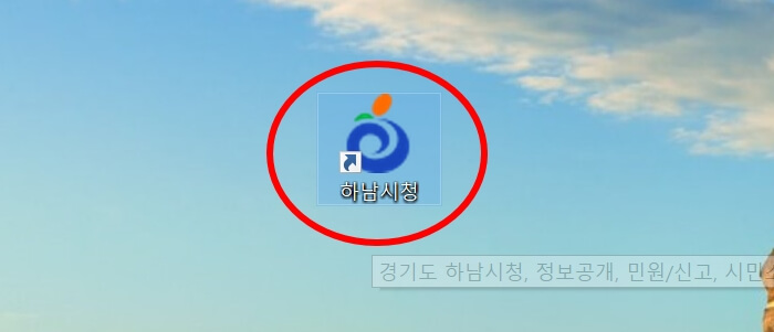 7. 바탕화면에 하남시청 아이콘이 생성이 됩니다. 하남시청 아이콘만 누르시면 하남시청 홈페이지에 바로 접속을 하실 수 있습니다. 그리고 하남시청 시정 주요 시책, 전자 민원창구, 사회복지, 관광 정보, 행정 서비스 등을 이용하실 수 있습니다.