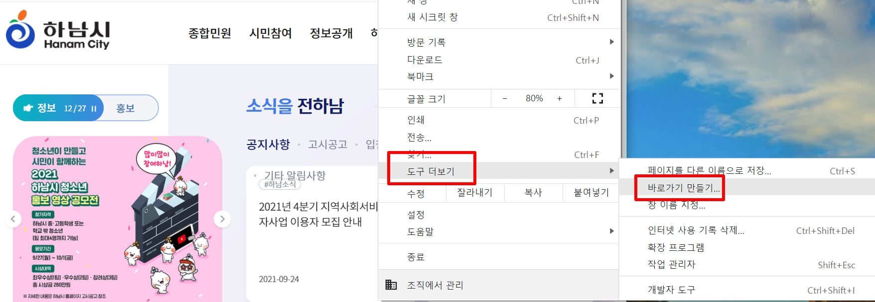 5. "도구 더보기" "바로가기 만들기"를 누릅니다.