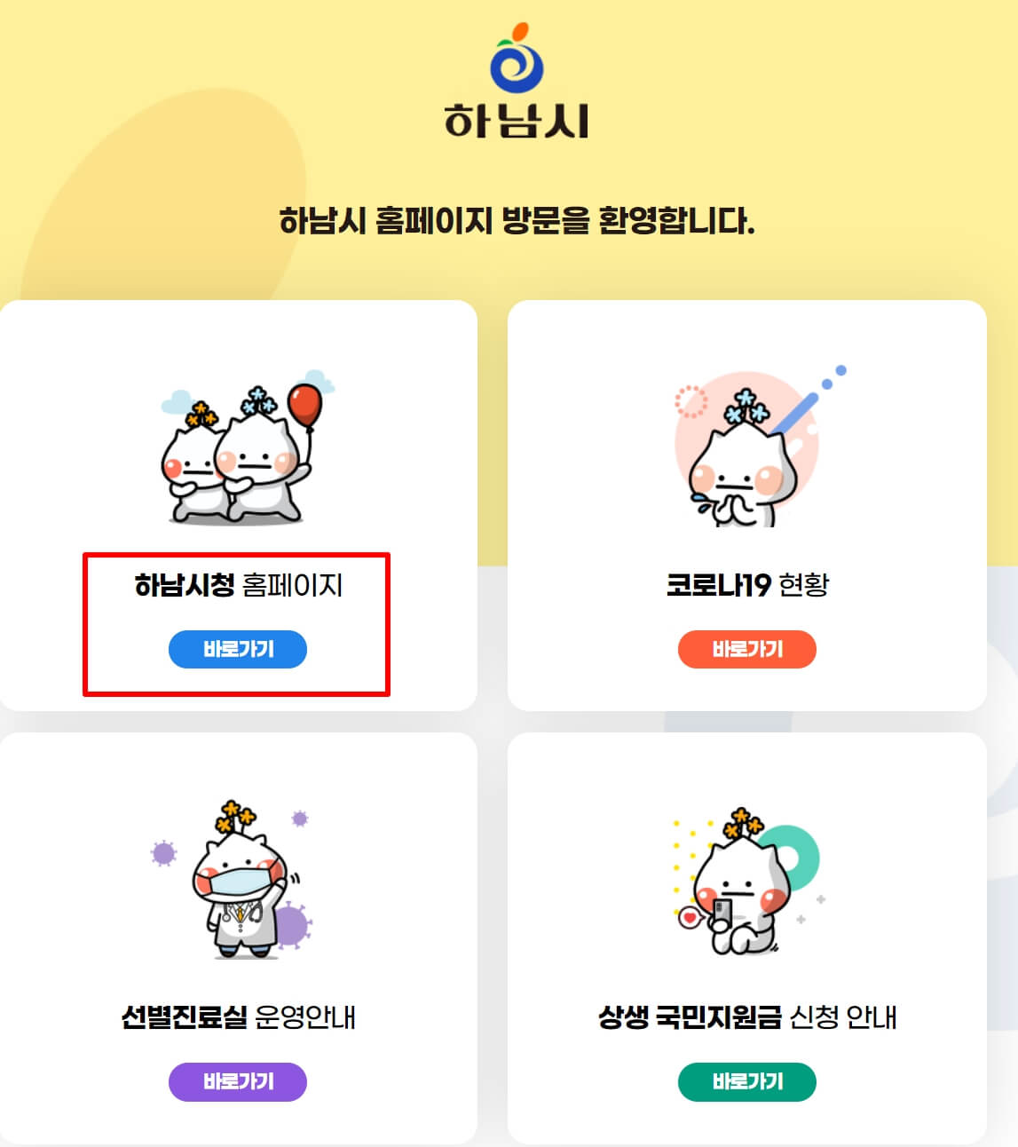 3. 하남시청을 누르셔서 접속을 하시면 하남시청 홈페이지에 바로 접속이 되지 않고, "하남시청 홈페이지 바로가기" "코로나19 현황 바로가기" "선별 진료실 운영 안내 바로가기" "상생 국민지원금 신청 안내 바로가기"가 나옵니다. 여기서 하남시청 홈페이지 바로가기를 누르셔서 접속을 합니다.