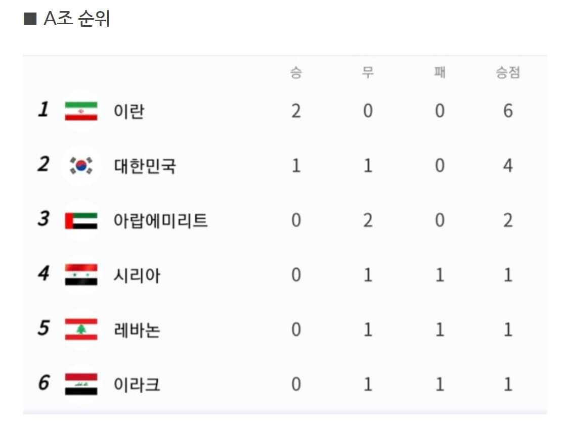 대한민국은 A조에 속해있고 2경기 치른 현재 조 2위를 달리고 있습니다. 각조 2위까지 카타르월드컵 본선에 진출하고, 각조 3위는 플레이오프를 치루어서 진출하게 됩니다. 10월에 치르는 시리아전, 이란전에서 최소 1승1무는 하여야 유리하게 갈수 있다고 하네요.