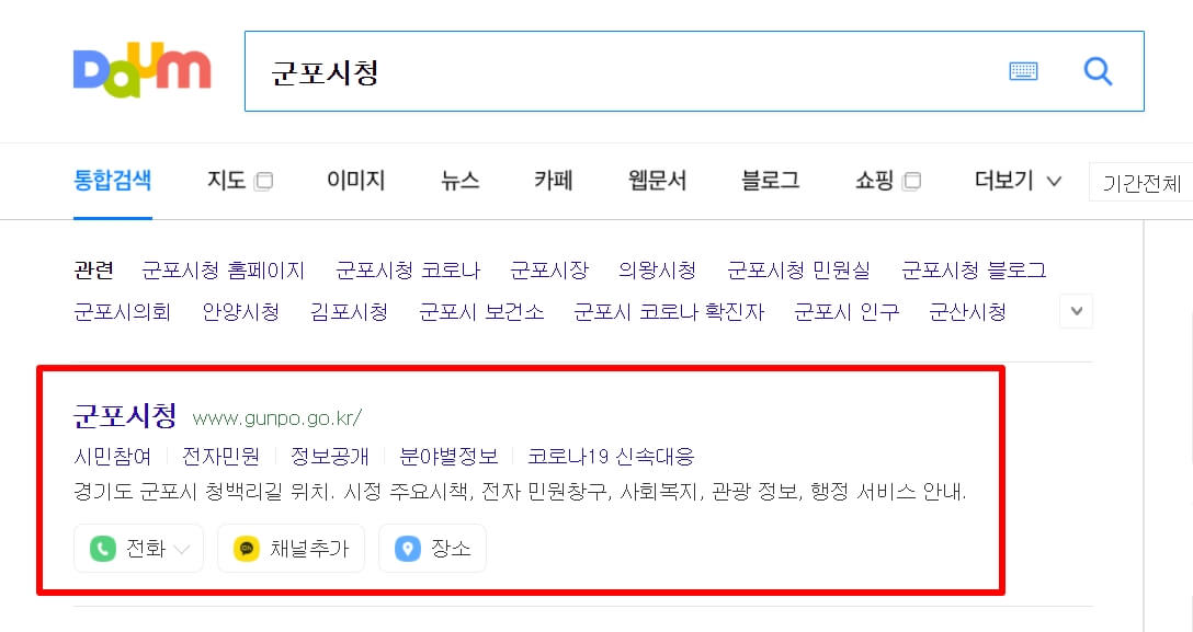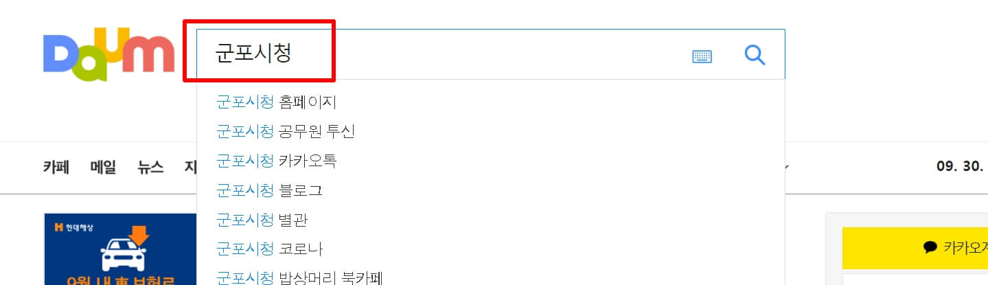 1. 다음(daum) 검색창에 "군포시청 홈페이지"라고 검색을 합니다.