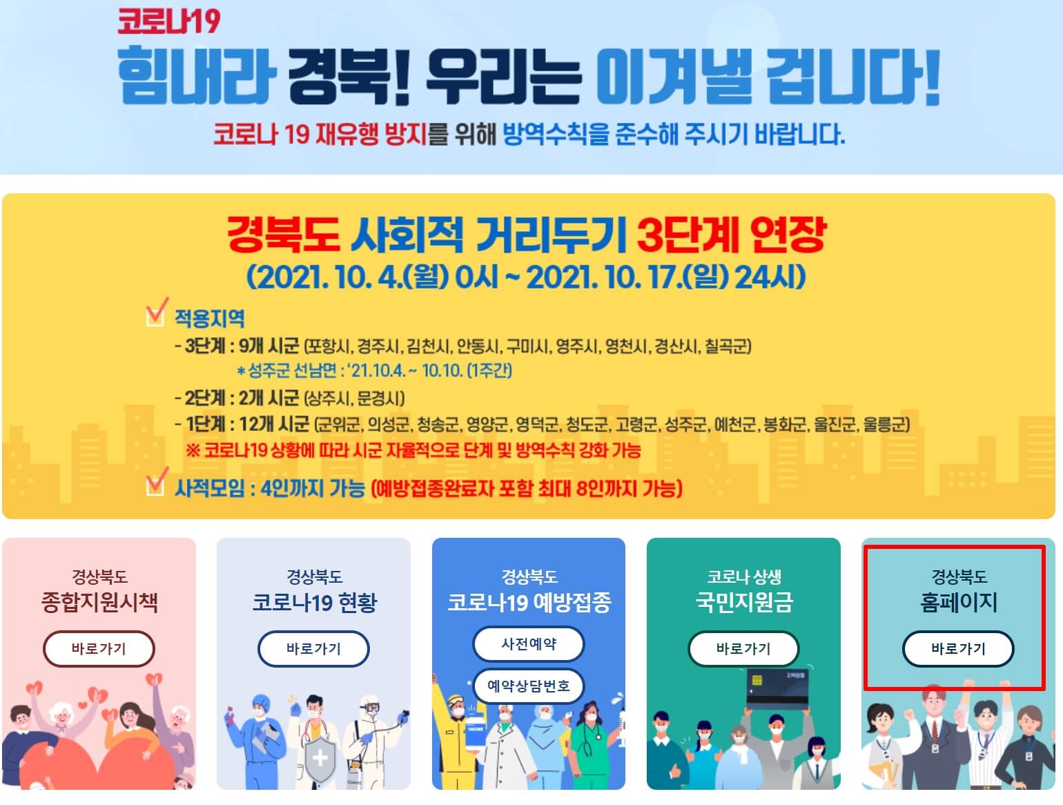 3. 경북도청 홈페이지로 바로 접속하지 않고, "경상북도 종합지원시책 바로가기" "경상북도 코로나19 현황 바로가기" "경상북도 코로나19 예방접종 사전예약" "코로나 상생 국민 지원금 바로가기" "경상북도 홈페이지 바로가기"가 나옵니다. 여기서 경상북도 홈페이지 바로가기를 누르셔서 접속을 합니다.