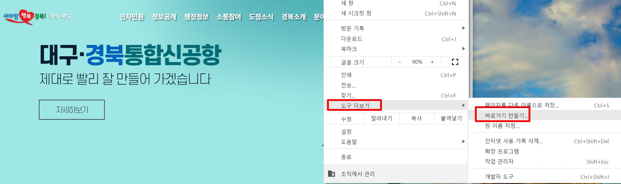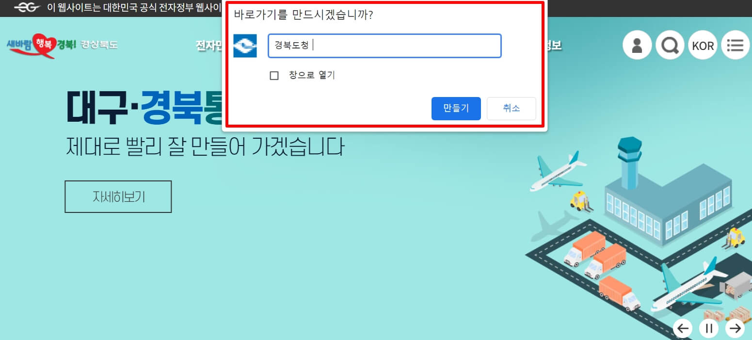 7. 바탕화면에 경북도청 아이콘이 생성이 됩니다. 경북도청 아이콘만 누르시면 경북도청 홈페이지에 바로 접속을 하실 수 있습니다. 그리고 경북도청 도정 주요 시책, 전자 민원창구, 사회복지, 관광 정보, 행정 서비스 등을 이용하실 수 있습니다.