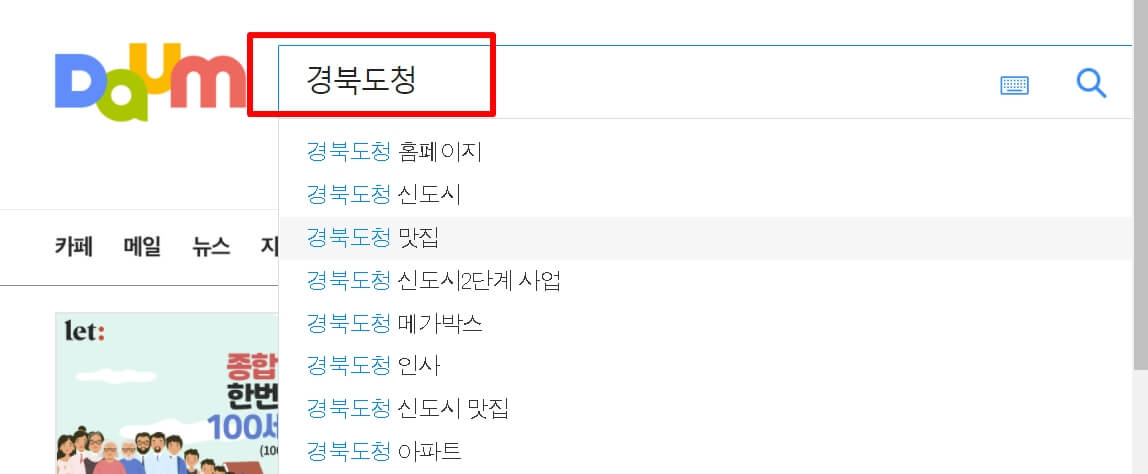 1. 다음(daum) 검색창에 "경북도청"라고 검색을 합니다.