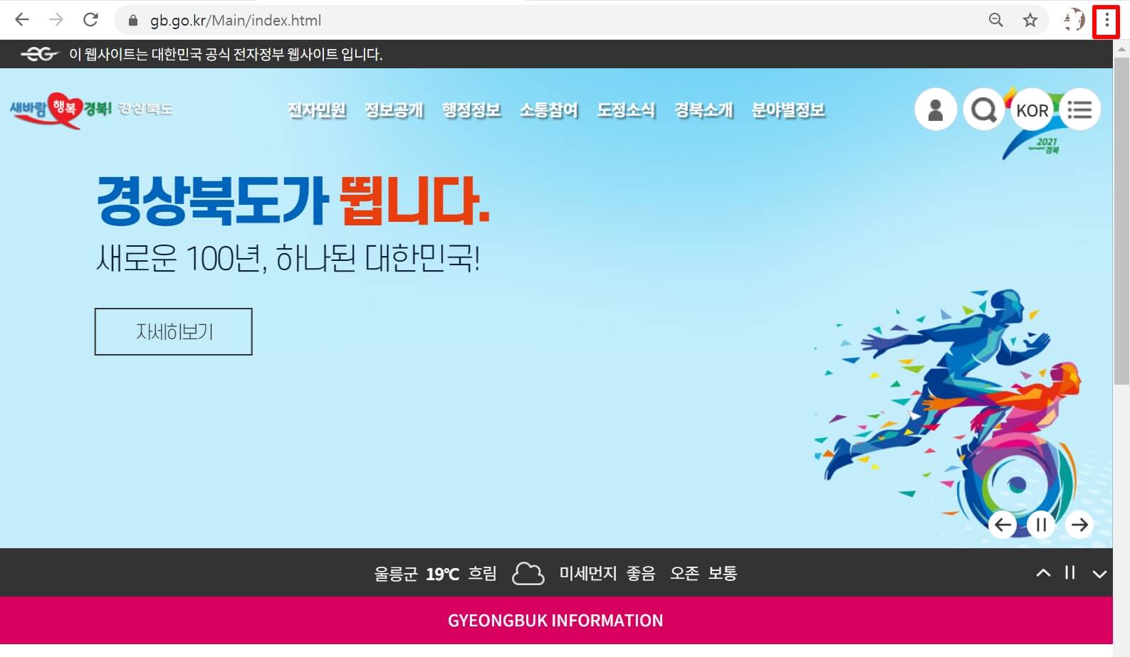 4. 경북도청 홈페이지에 들어가셔서 오른쪽 상단에 보시면 "점 3개"를 누릅니다.