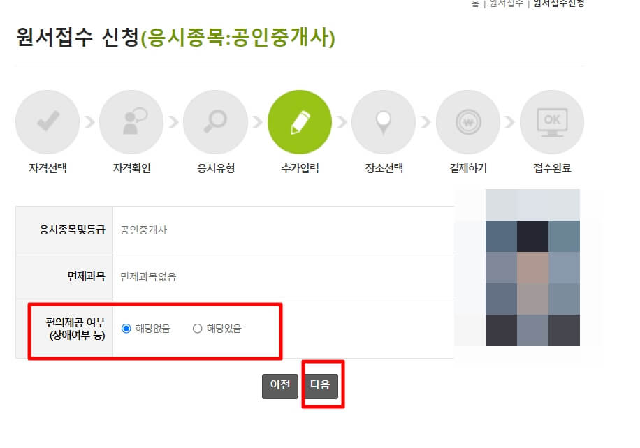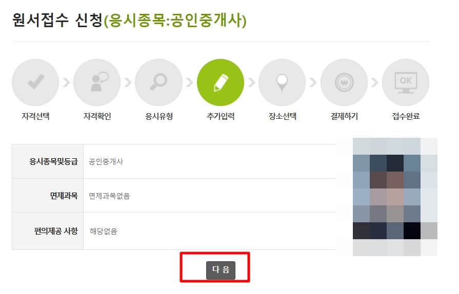 11. 응시 종목 및 등급, 면제 과목, 편의제공 여부(장애여부 등)가 나옵니다. 그리고 우측에 접수자의 사진이 나옵니다. 확인 후, 다음을 누릅니다.
