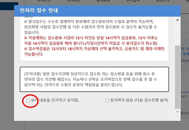 5. 빈자리 접수 안내가 나옵니다. "상기 내용을 인지하고 동의함"을 체크하고 확인을 누릅니다.