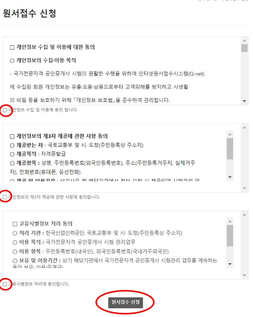 4. 개인정보 동의를 3군데 체크한 후, 원서접수 신청을 합니다.