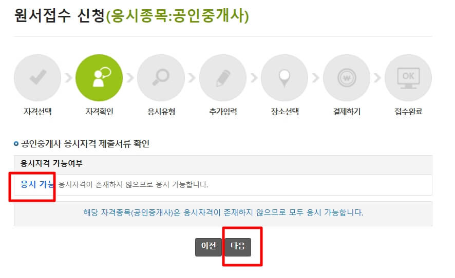 9. 공인중개사 결격사유가 없으면 응시 가능이라고 나옵니다. 확인 후, 다음을 누릅니다.